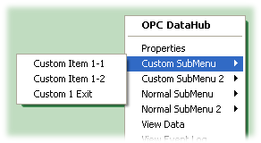 The methods used here cause a submenu to be created on the main DataHub pop-up menu, and attach items directly to that submenu. This code: