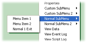 There are a number of methods in the Application class that you can use to create submenus and menu items on the DataHub pop-up system tray menu. Rather than examining the code, let us look at what kinds of menus can be generated. Each of the menus below has two regular items that simply print their name in the Script Log, as well as an "Exit" item that shuts down the script. A complete, working script containing all of these examples is given below. All of the methods used here are documented in Methods and Functions from Application.g.